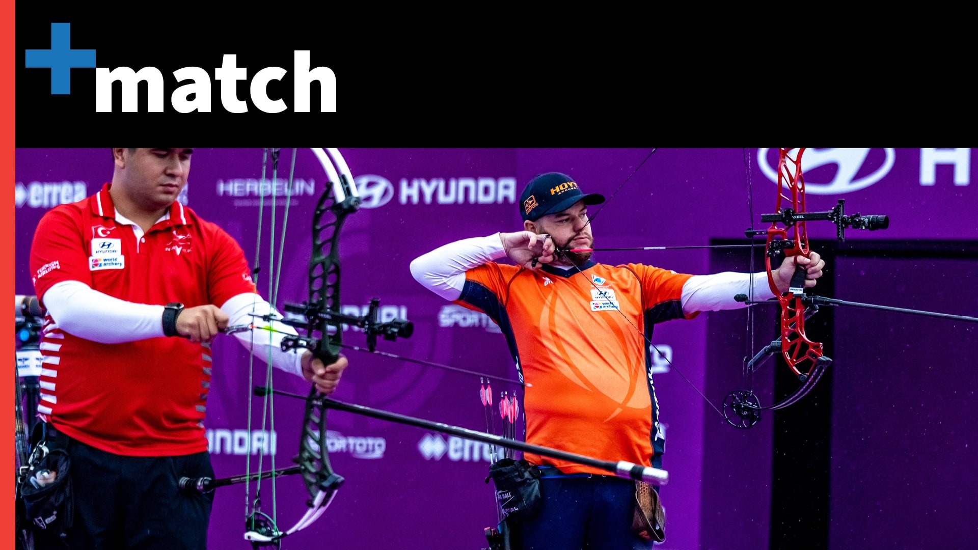 Compound men’s quarterfinal match between Michea Godano (Italy) and Mathias Fullerton (Denmark) on 18 October at the 2025 Hyundai Archery World Cup Final in Nanjing, China.